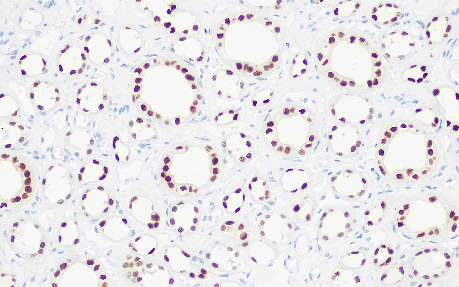 Pax-8是核转录调节因子的配对盒子家族成员之一,是一种核蛋白。在甲状腺的滤泡细胞、肾脏和勒氏管的器官发生过程中存在表达。PAX8在卵巢的浆液性细胞癌、内膜样细胞癌和透明细胞癌中表达,但在卵巢粘液性细胞癌中几乎无表达。PAX8在98%的肾透明细胞癌,90%乳头状细胞癌和95%的嗜酸性细胞瘤中表达,其在肾肿瘤的表达频率与PAX2相似。所以,PAX8又成为肾肿瘤的参考依据中的一员。